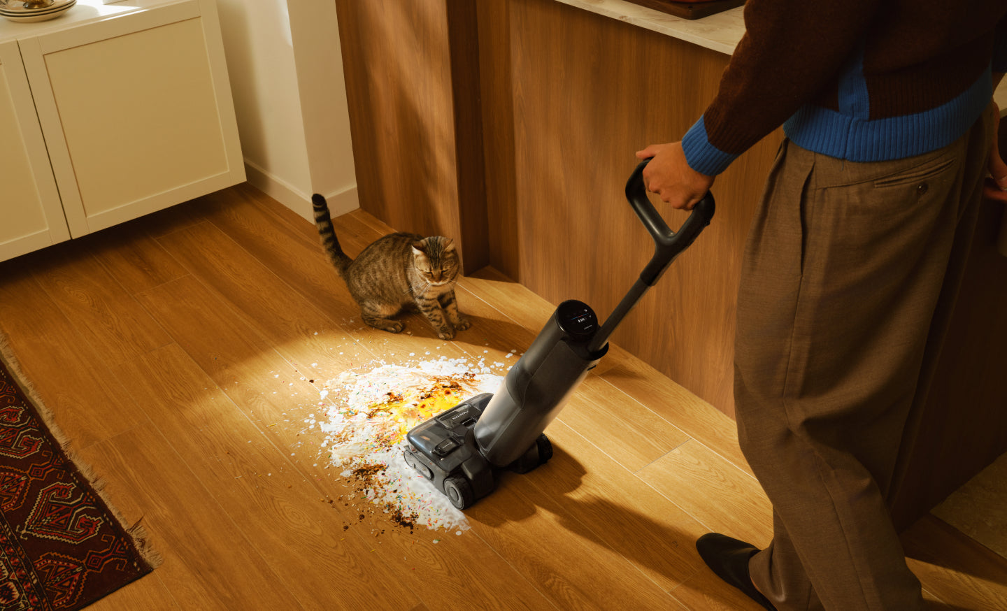 Das System bleibt einsatzbereit, selbst wenn es aufrechtstehend pausiert, um bei Möbeln oder in Schwellenbereichen zu navigieren. Kein Warten, kein Neustart, einfach immer weiter reinigen.*
