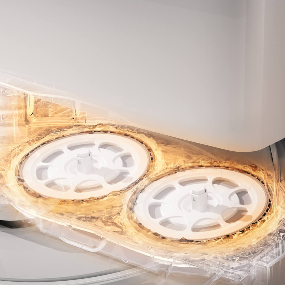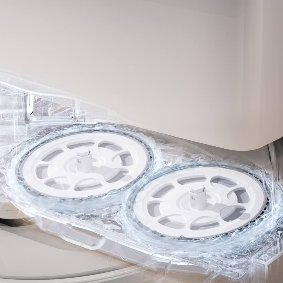 5. Basierend auf Tests, die durch den TÜV Rheinland bei Staphylococcus aureus und Escherichia coli unter Verwendung des standardmäßigen Selbstreinigungsmodus ausgeführt wurden, werden über 99,7 % der Bakterien auf den rotierenden Mopps wirksam beseitigt. Prüfbericht-Nr.: 244555550b1 001. Die tatsächlichen Ergebnisse können je nach häuslicher Umgebung variieren.