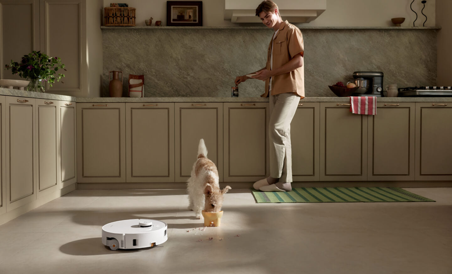 "KI-Schmutzerkennung" ist das Zauberwort: das adaptive Reinigungssystem erkennt sofort, um welche Art von Schmutz es sich handelt. Bei starkem Staub erhöht es die Saugleistung, um jeden Partikel zu erwischen. Bei Flüssigkeiten oder nassem Schmutz wechselt es in den Modus „Nur wischen“ und hebt die Seitenbürsten sowie die Hauptbürste an, um eine Kreuzkontamination zu vermeiden. Ob kleine oder hartnäckige nasse Verschmutzungen - das System wählt jedes Mal die perfekte Reinigungsstrategie.