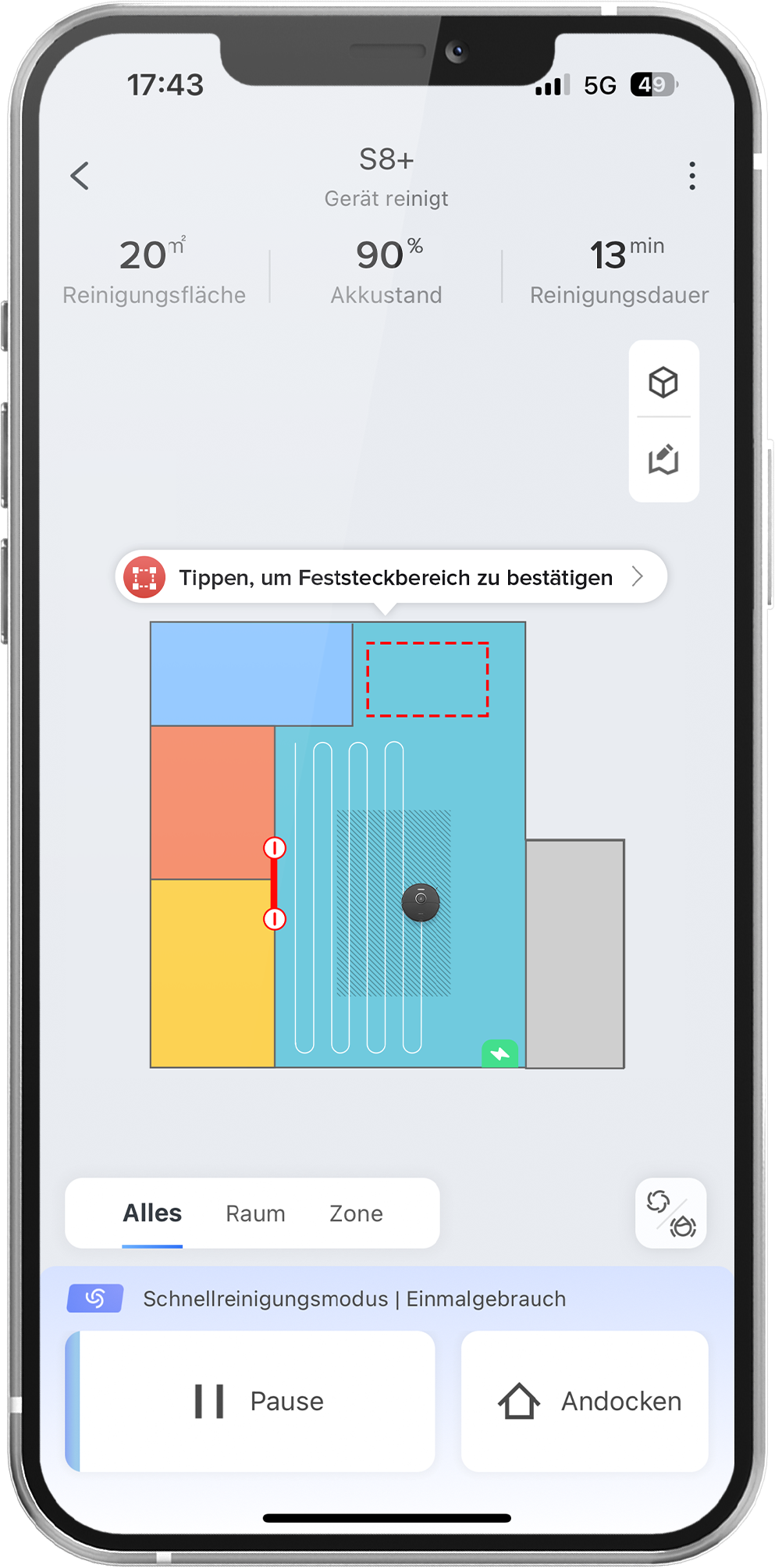 8. Basierend auf internen Tests, die vom Hersteller durchgeführt wurden, kann der S8 Objekte bis zu einer Breite von 5 cm und einer Höhe von 3 cm erkennen und umgehen. Die Genauigkeit der Erkennung kann je nach Umgebungsfaktoren variieren.