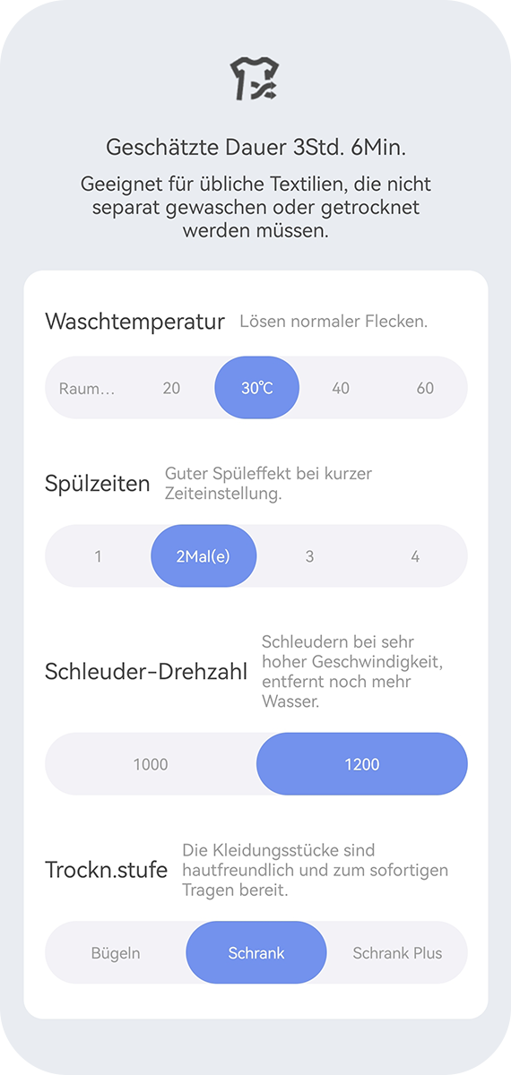 Passen Sie die Wasch- und Trocknungsmodi mit individuellen Einstellungen an, zum Beispiel die Wassertemperatur, Spülzeiten, Trockengrad und mehr, für das bestmögliche Ergebnis.