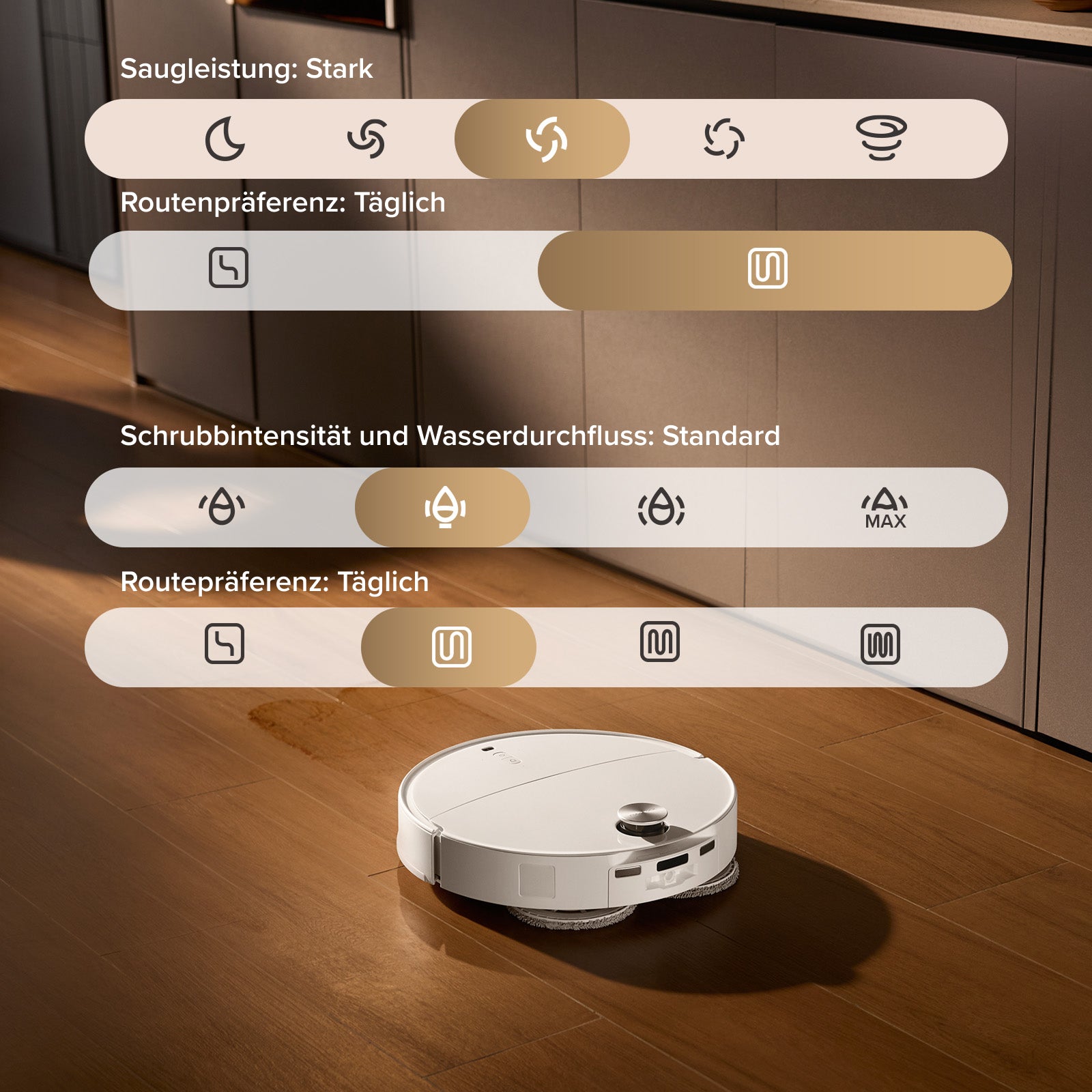 Stelle den Modus Leises Reinigen in der Nacht ein und wähle den höchsten Schrubbmodus aus, wenn trockene Flecken auf dem Boden sind, um noch frischer in den Morgen zu starten!
