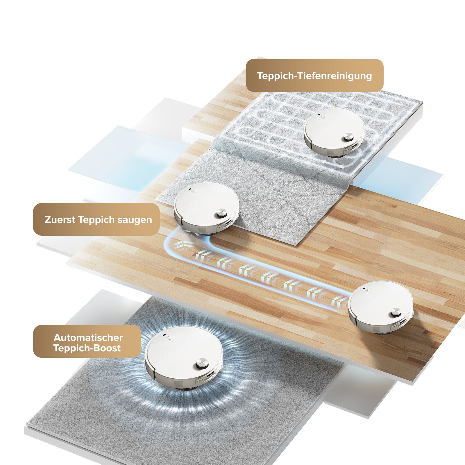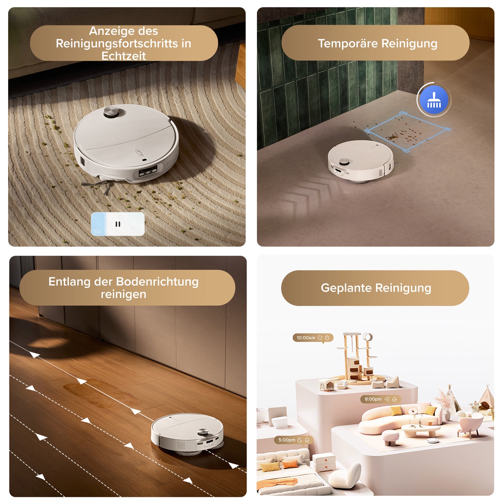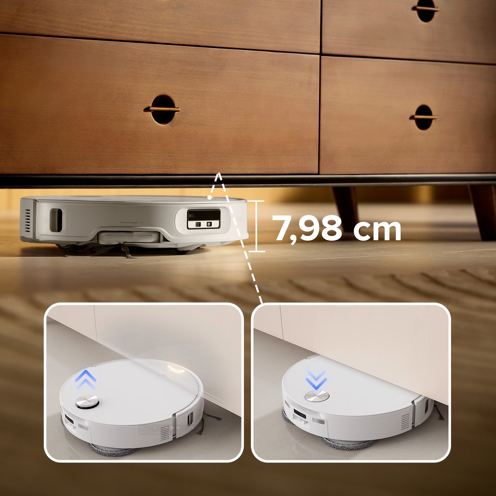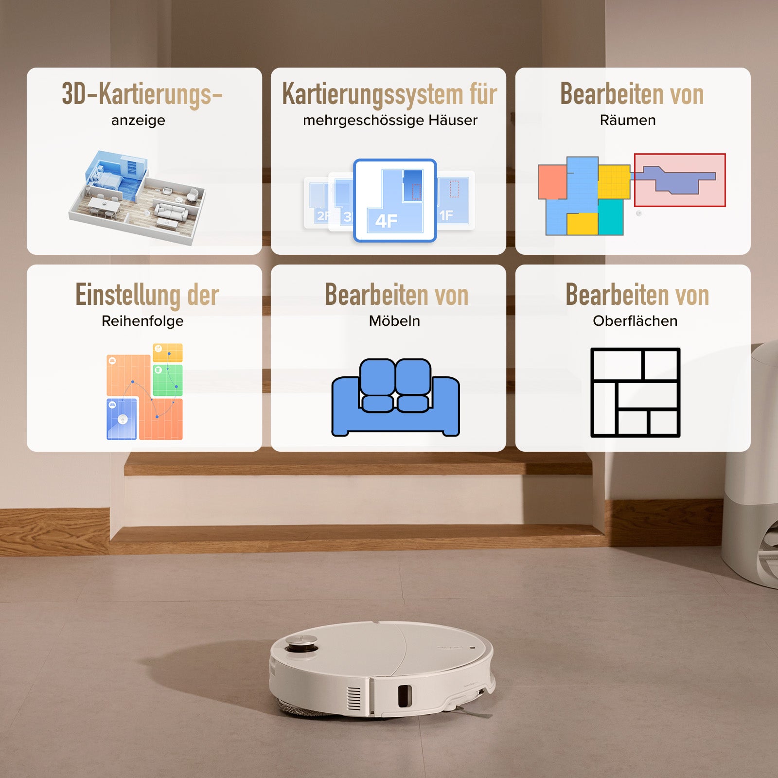 1. HyperCleaning System - 22.000Pa HyperForce-Saugkraft - 6400 mAh Akkukapazität.- Anti-Verwirrungs-System: DuoDivide Bürste + FlexiArm Seitenbürste - 12N Pressurized Mopping + Warmwasserwischen 2. AdaptiLift-Fahrgestell - Der Roboter hebt automatisch das Kugelrad oder das Hauptrad an, um Standardschwellen bis zu 3 cm und komplexe doppelschichtige Schwellen bis zu 4 cm zu bewältigen3. Flächendeckendes Design - 7,98 cm ultra-schlankes Design - FlexiArm Design Seitenbürste & Mop sorgen für eine bessere Kantenreinigung.4. Navigation & HindernisvermeidungHebbarer LDS mit Aufwärtssensor, strukturiertem Licht, verbesserten Wanderkennungssensoren, ToF-Klippensensoren und RGB-Kamera für präzise Navigation und Hindernisvermeidung.5. Multifunktions-Dock. - 80°C / 176°F Heißwasser-Mop-Wäsche und 80°C / 176°F Heißwasser-Dock Selbstreinigung - WarmwasserAutomatische Nachfüllung - Intelligente Schmutzerkennung für Re-Wash & Re-Mop - 45°C / 113°F Warmlufttrocknung - Automatisches Entleeren von Staub