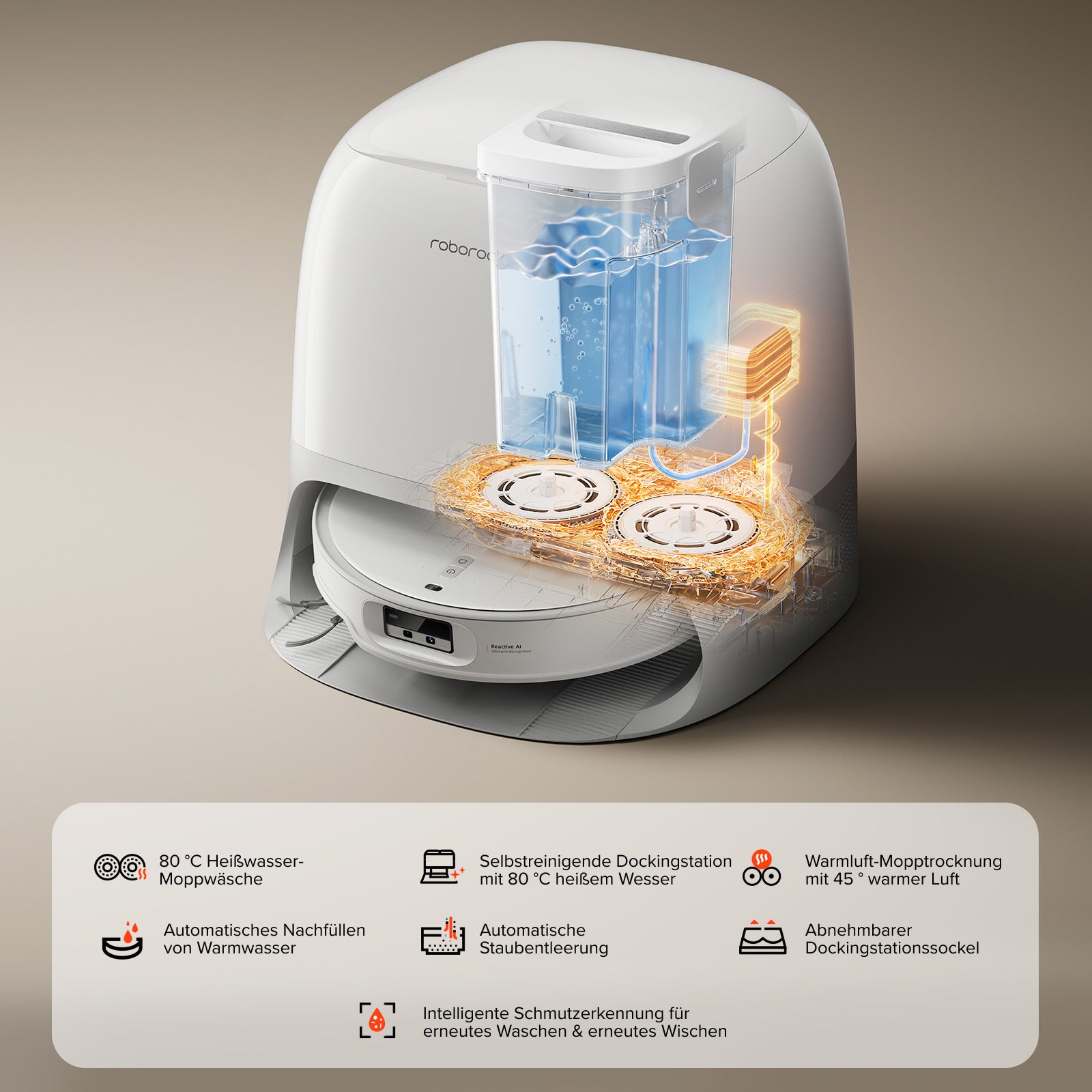 13. Basierend auf internen Roborock-Tests kann das Wasser an den Reinwasserdosierern der Dockingstation auf bis zu 80 ℃ bei üblicher Raumtemperatur erwärmt werden. Die tatsächliche Temperatur variiert aufgrund von Umgebungsfaktoren.