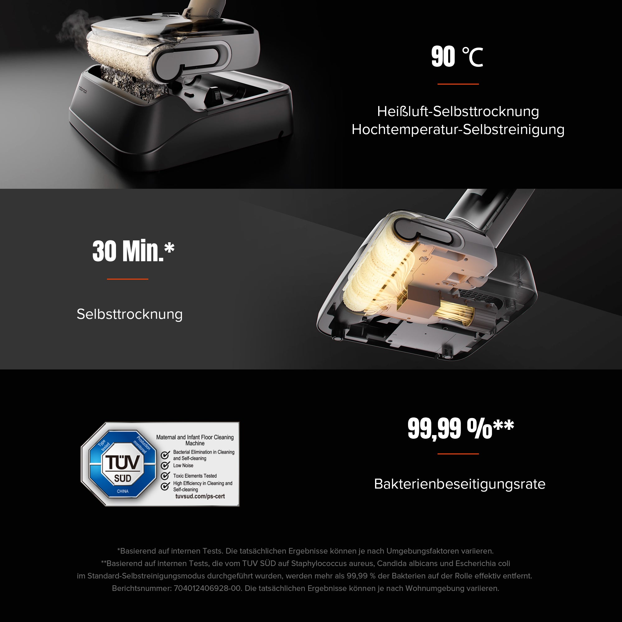A: 1. Absaugleistung: 20.000 Pa – Starke Absaugleistung für eine gründliche Reinigungverschiedener Oberflächen.2. Höhe im flachen Zustand: 12,5 cm / 4,92 Zoll – Der Staubsauger kann flach hingelegt werden, um unterMöbeln und Geräten zu reinigen und er gewährleistet eine tiefere Reinigung inschwer zugänglichen Bereichen. 3. Selbstreinigung und Trocknungstemperatur: 90°C. 4. Doppelschaber: Schwebender Schaber mit konstantem Druck +Anti-Verhedderungs-Kammschaber – Der Doppelschaber wurdeentwickelt, um Haare aufzusammeln und zu verhindern, dass sie sich in der Rolleverwickeln. 5. Rollensystem: Eine Rolle + Kantenreinigung (beide Seiten 1 mm). 6. Wassertankvolumen: Der Frischwassertank fasst 870 ml, der Schmutzwassertank 720 ml. 7. Betriebszeit: 40 Minuten (ECO-Modus)– Bietet eine lange Betriebszeit, um große Flächen ohne Unterbrechungen zu reinigen. Trockungszeit: 30 Minuten –Schnelles Trocknen für maximalen Komfort nach der Reinigung.