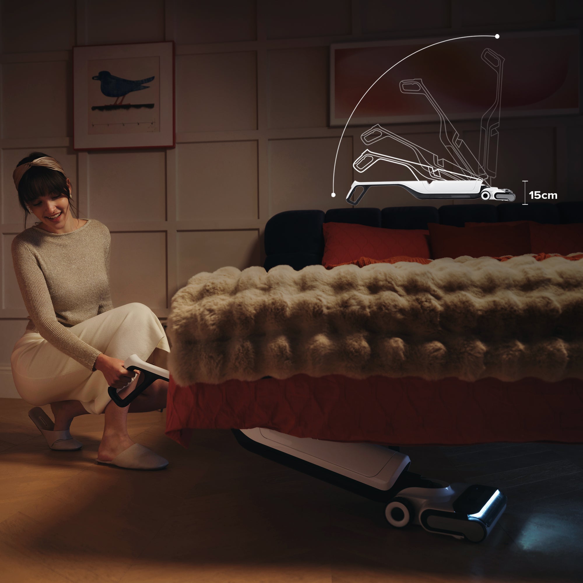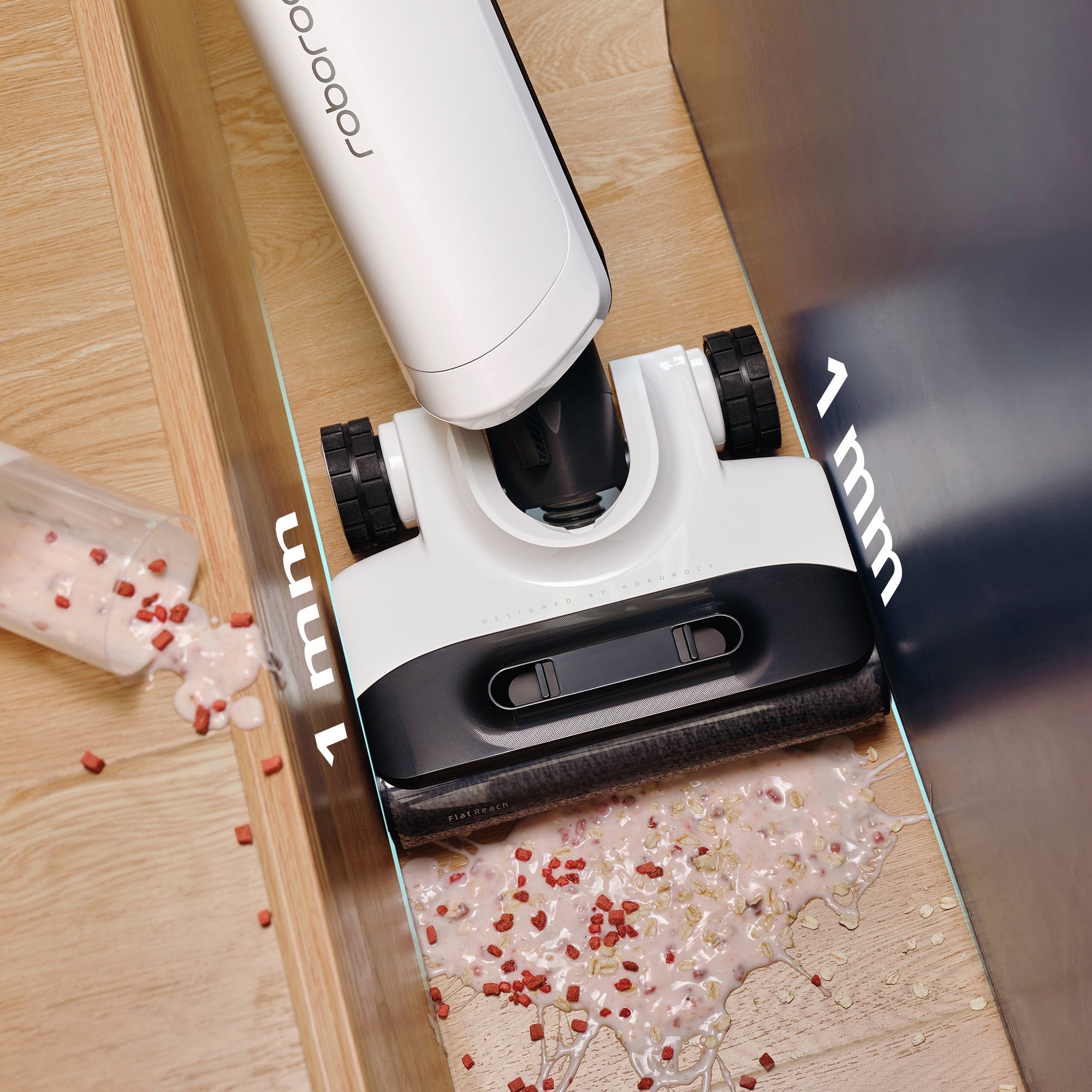 Mithilfe seiner FlatReach™-Technologie ermöglicht der Roborock Flexi Pro eine gründliche Reinigung unter niedrigen Möbeln.Dank des FlatReach-Designs von Roborock mit integriertem LED-Licht erreicht der Reinigungskopf auch Flächen unter 15 cm* niedrigen Möbeln.