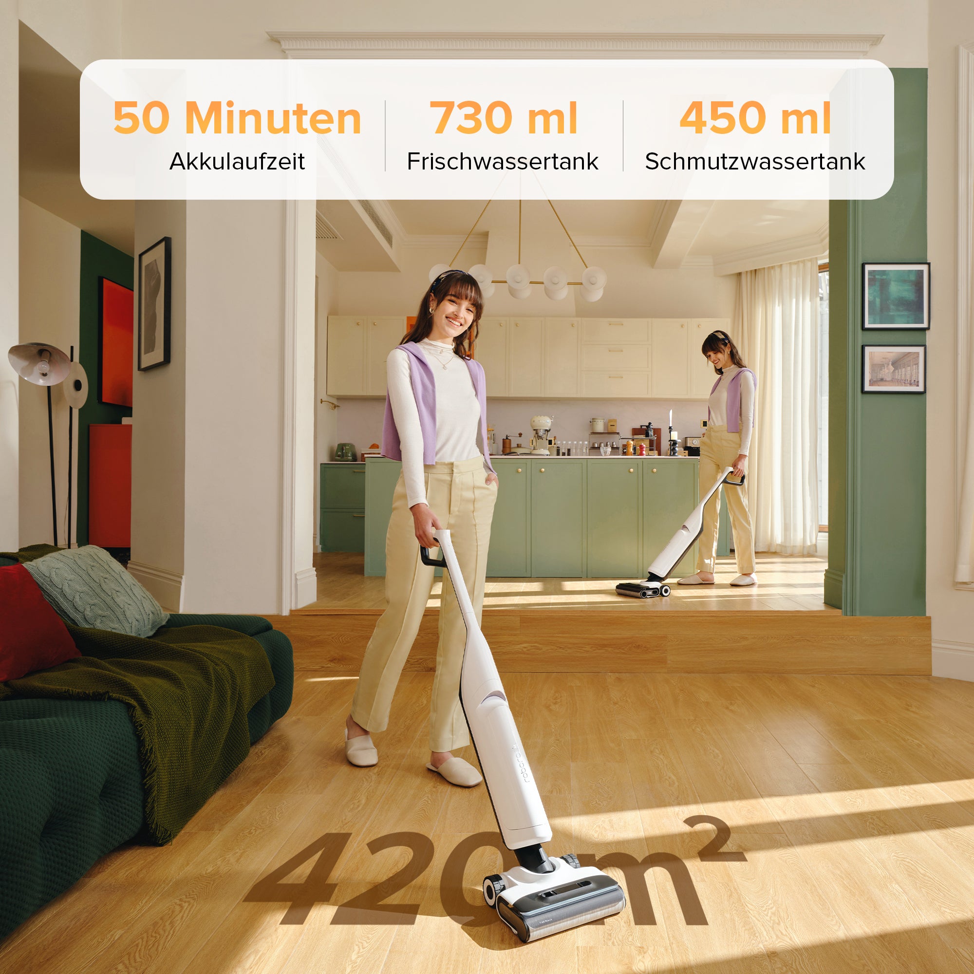 Der Akku mit 50 Minuten* Laufzeit sorgt für eine ununterbrochene Reinigung; die Behälter decken eine Fläche von 420 m²* ab, bevor sie geleert oder nachgefüllt werden müssen.