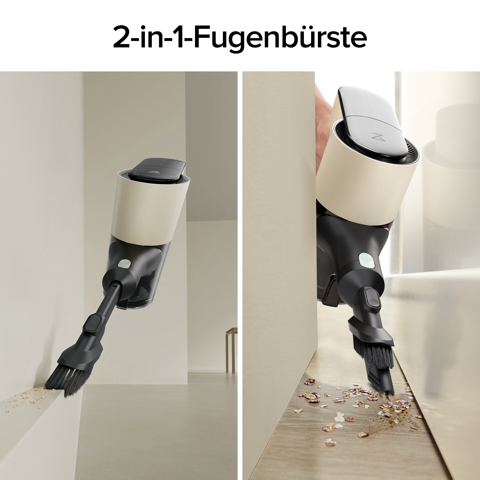 Mit dieser 2-in-1-Fugenbürste können Sie mühelos zwischen dem Bürsten Ihres Autos und dem Saugen von schwer zugänglichen Ecken wechseln.