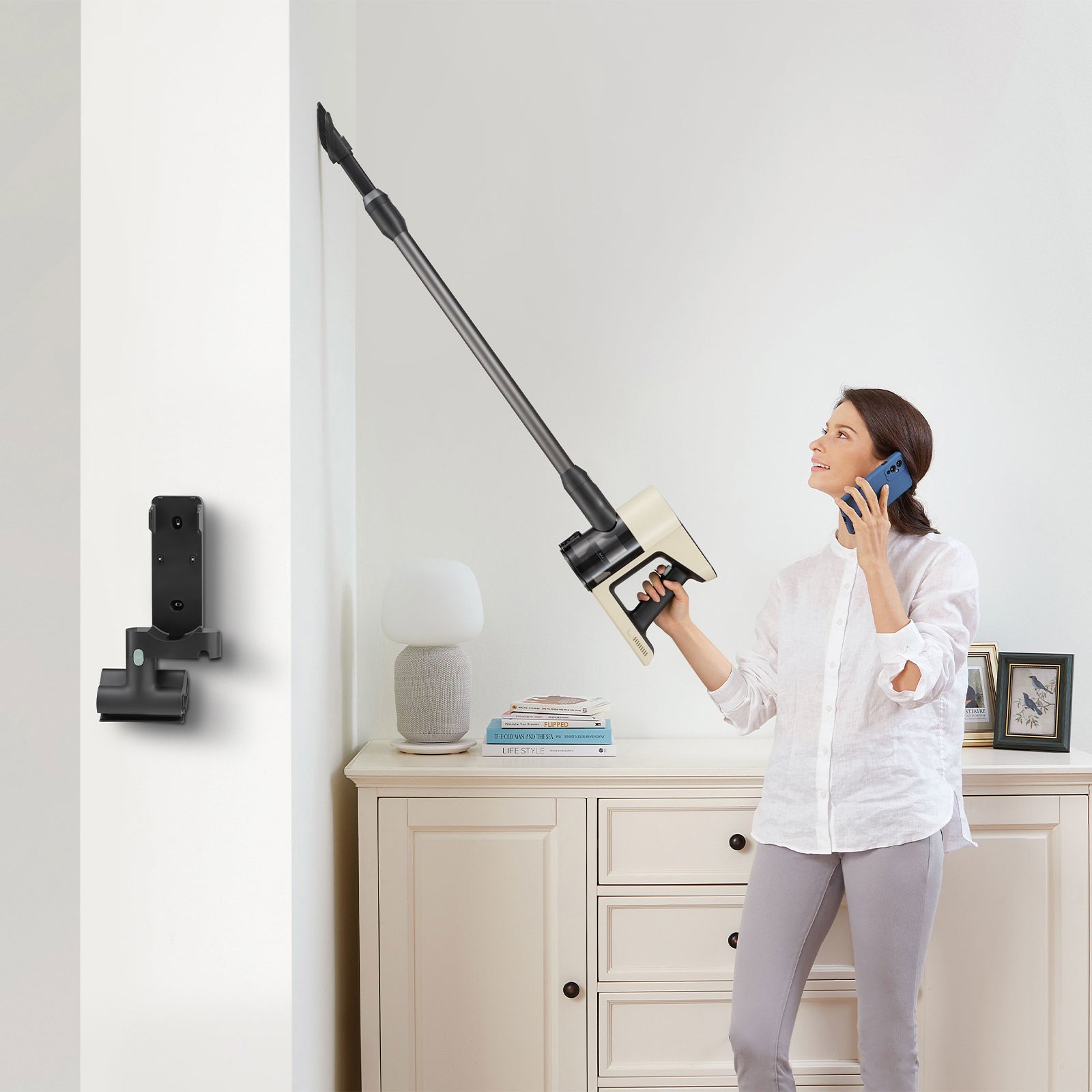 Verstau all deine Reinigungsköpfe ordentlich auf dem wandmontierten Ladedock.