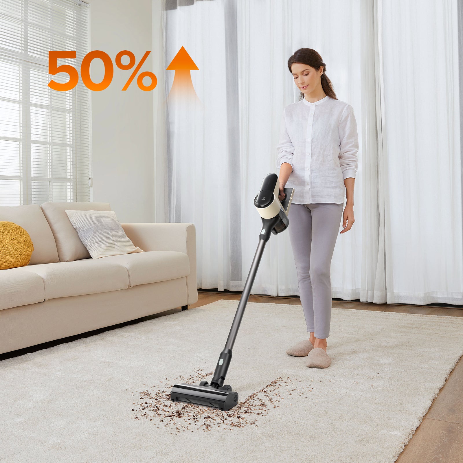 Wenn die Hauptbürste im Standardmodus auf Teppich saugt, wird automatisch der Teppich-Boost aktiviert, um eine bessere Gründlichkeit bei der Entfernung von Staub und Haaren auf dem Teppich zu erzielen.2