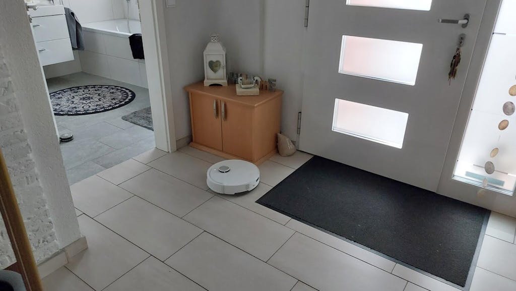 3. Nach dem Reinigen von Bereichen wie Küchen und Badezimmern hebt der Roboter automatisch seinen Mopp an, wenn er zur Dockingstation für Moppwäsche oder Aufladen zurückkehrt. Dies verhindert, dass aufgesammelter Schmutz mit bereits gereinigten Böden in Kontakt kommt, und sorgt für Sauberkeit in Ihrem gesamten Zuhause.