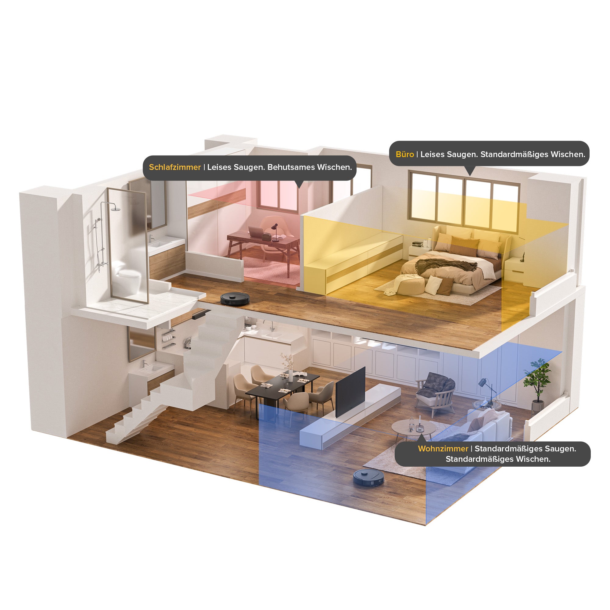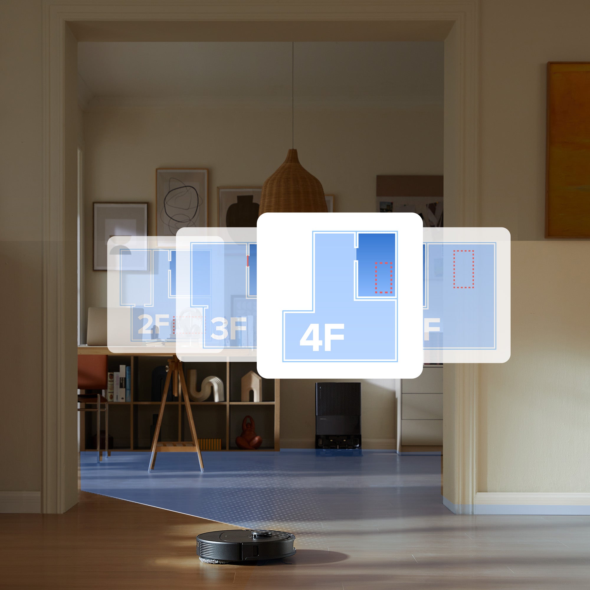 Das Kartierungssystem für mehrgeschössige Häuser erkennt und erstellt automatisch Karten bis zu 4 Stockwerken. Setz deinen Roborock einfach auf den Boden und er erkennt die neue Umgebung.