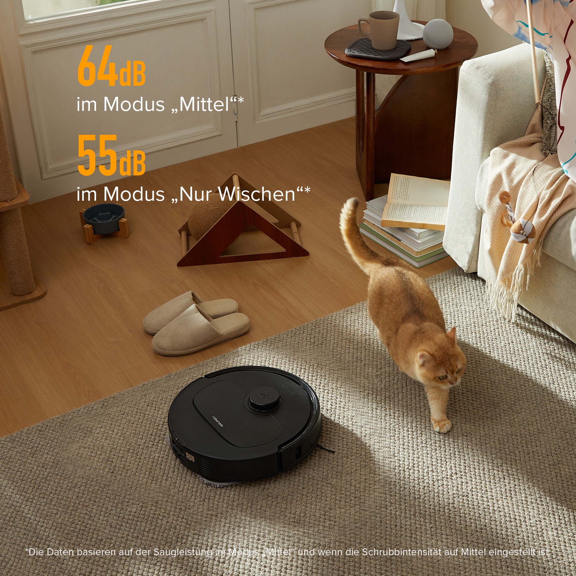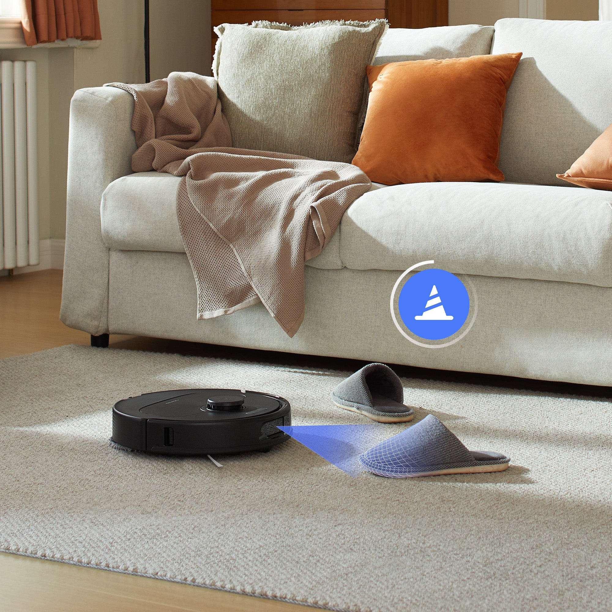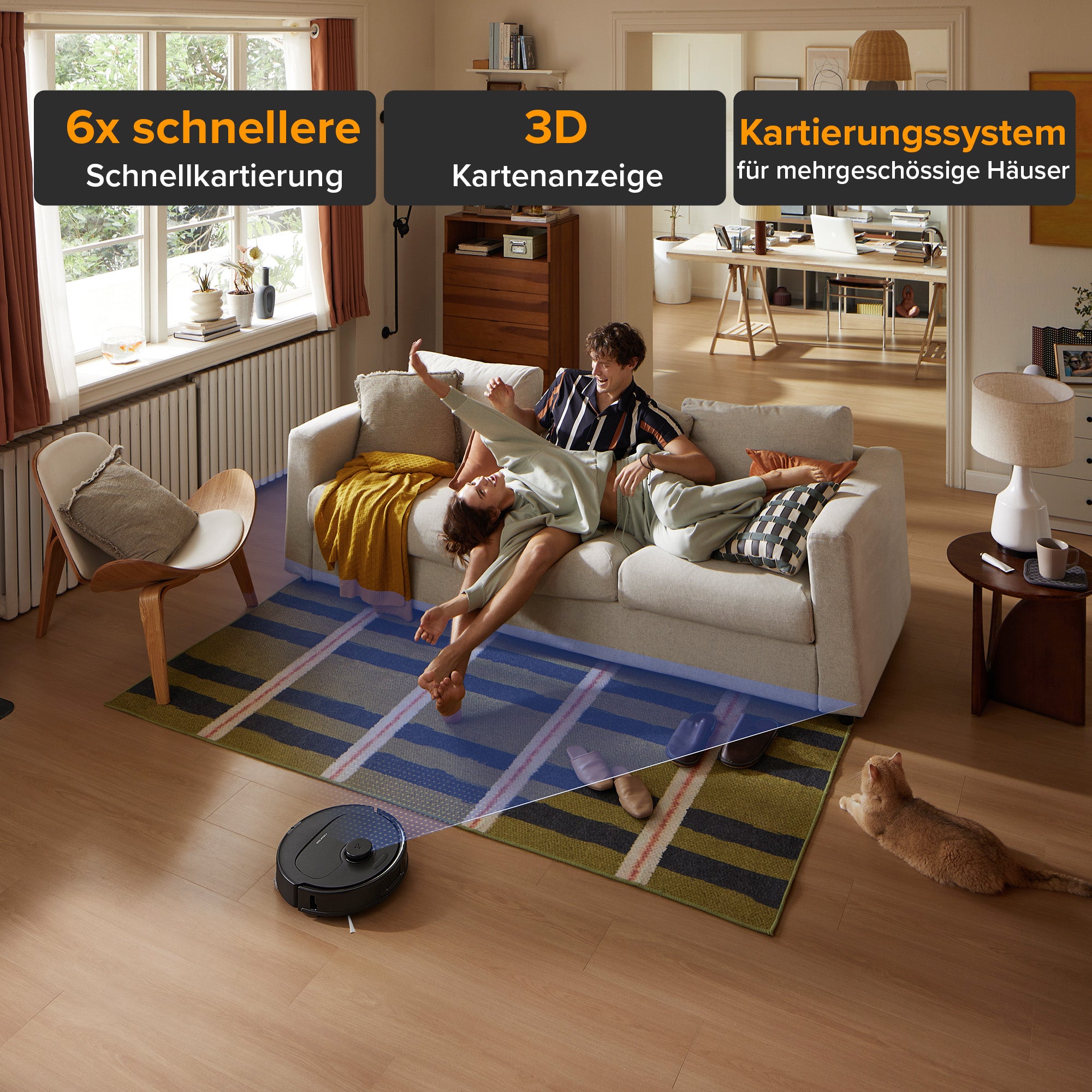 Dank strukturiertem Licht ist er in der Lage, Hindernisse mühelos zu erkennen und zu umfahren, und das selbst in unordentlichen Räumen, in denen Gegenstände auf dem Boden verteilt sind.
