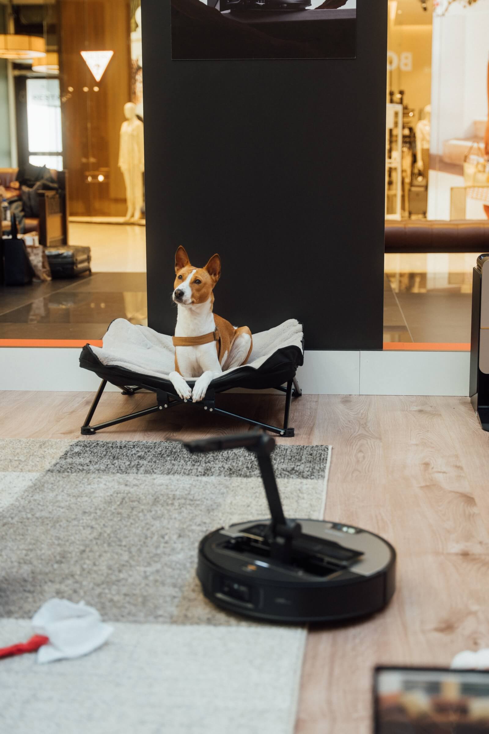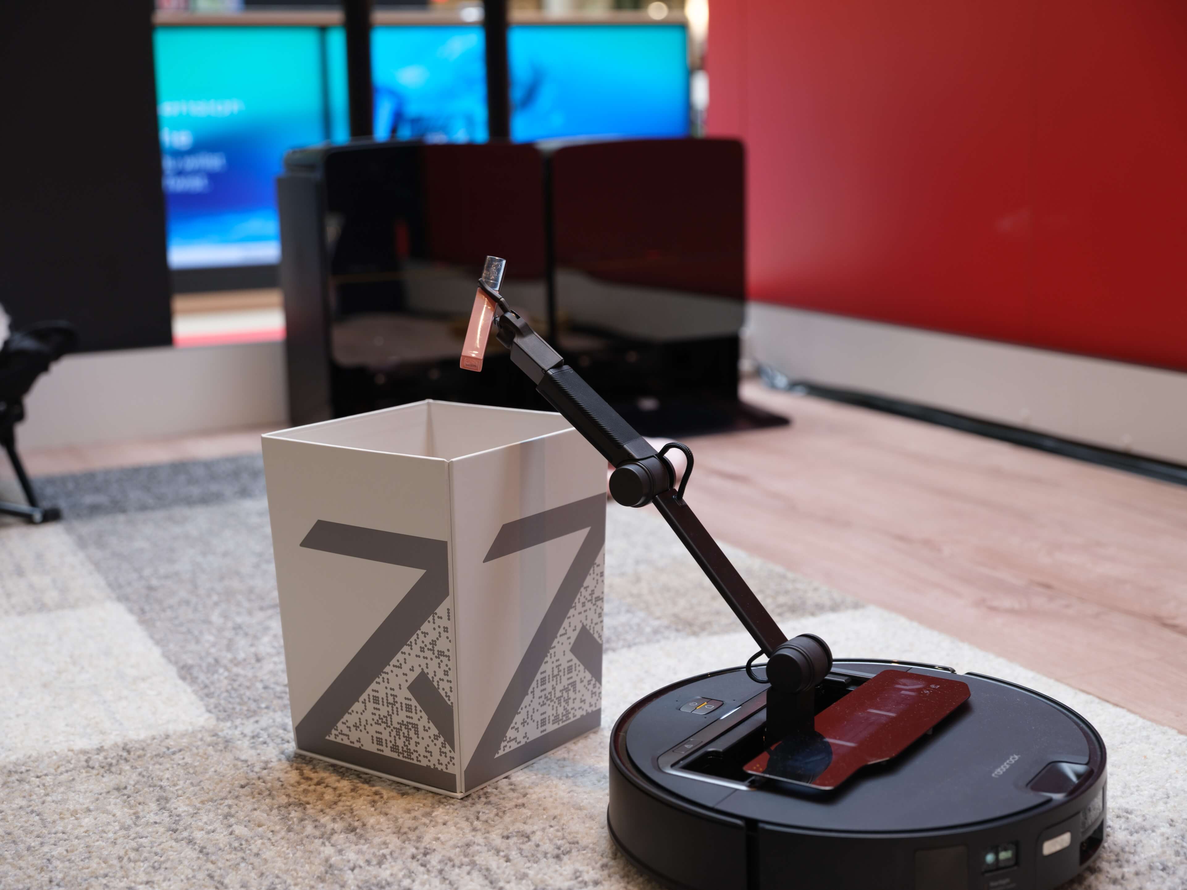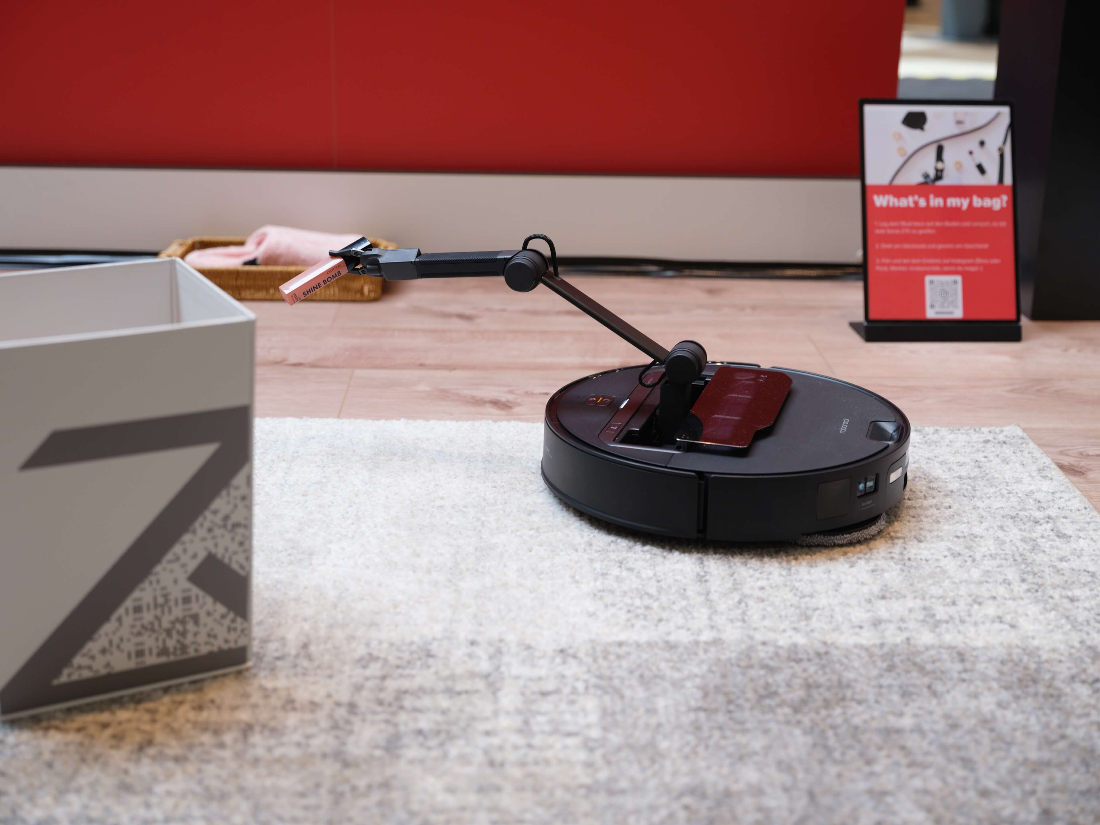 1. Nach der Reinigung fährt der Roboterarm aus und schiebt greifbare Hindernisse zur Seite, damit auch die zuvor verdeckten Bereiche optimal gereinigt werden können.